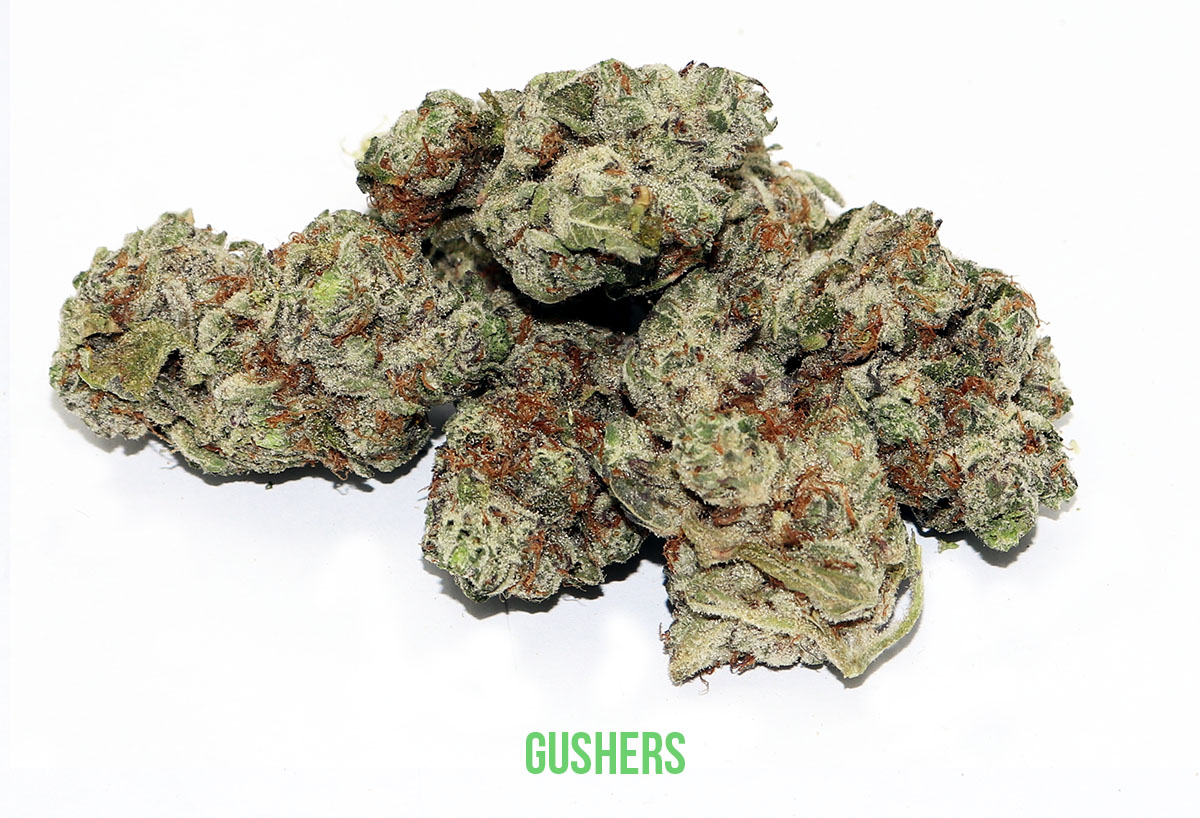 Gushers (also referred to as Fruit Gushers or White Gushers) is an indica-dominant hybrid that is a cross between Triangle Kush and Gelato #41.